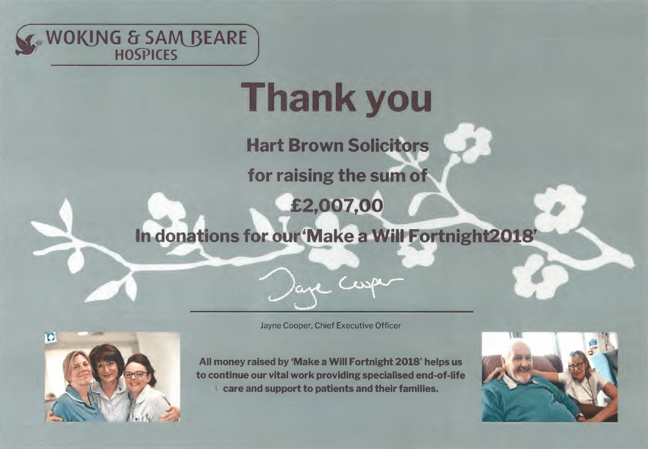 As a regular supporter of the Woking & Sam Beare Hospices ‘Make a Will Fortnight’ I am really proud to report that 2018 has proved to be our most successful year yet, with total donations exceeding £2,000!